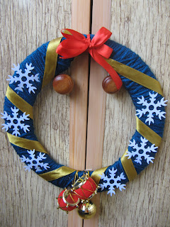 5.Идея создать такой вот веночек на дверь была давно, но все никак руки не доходили. А дошли, когда... (аж самой смешно) купили мультиварку и в ней были круглые картонные вкладыши-прослойки)))) Оставалось только вырезать внутреннее кольцо - и заготовка готова!!! Ее обмотала блестящими зелеными и синими нитками, украсила лентами, повесила пару настоящих елочных игрушек, ну и по всему периметру украсила снежинками))) Раньше у нас на двери висел тоже самодельный веночек, но из дождика. А тут - захотелось чего-то более "теплого" - нитки как раз такие!!!